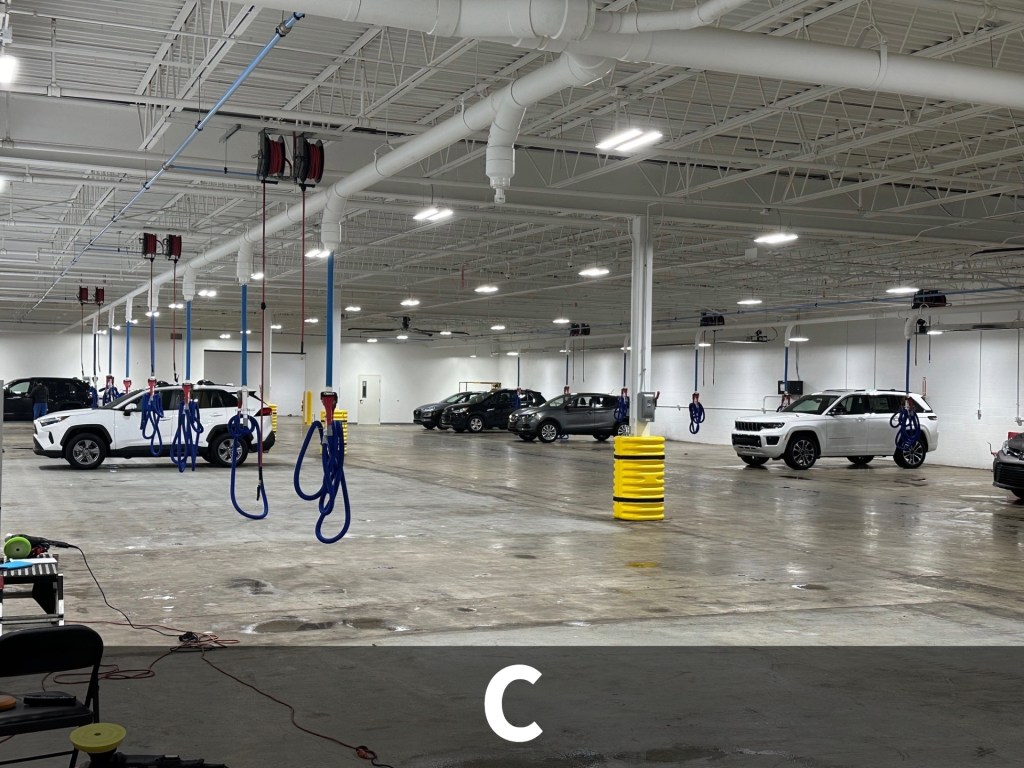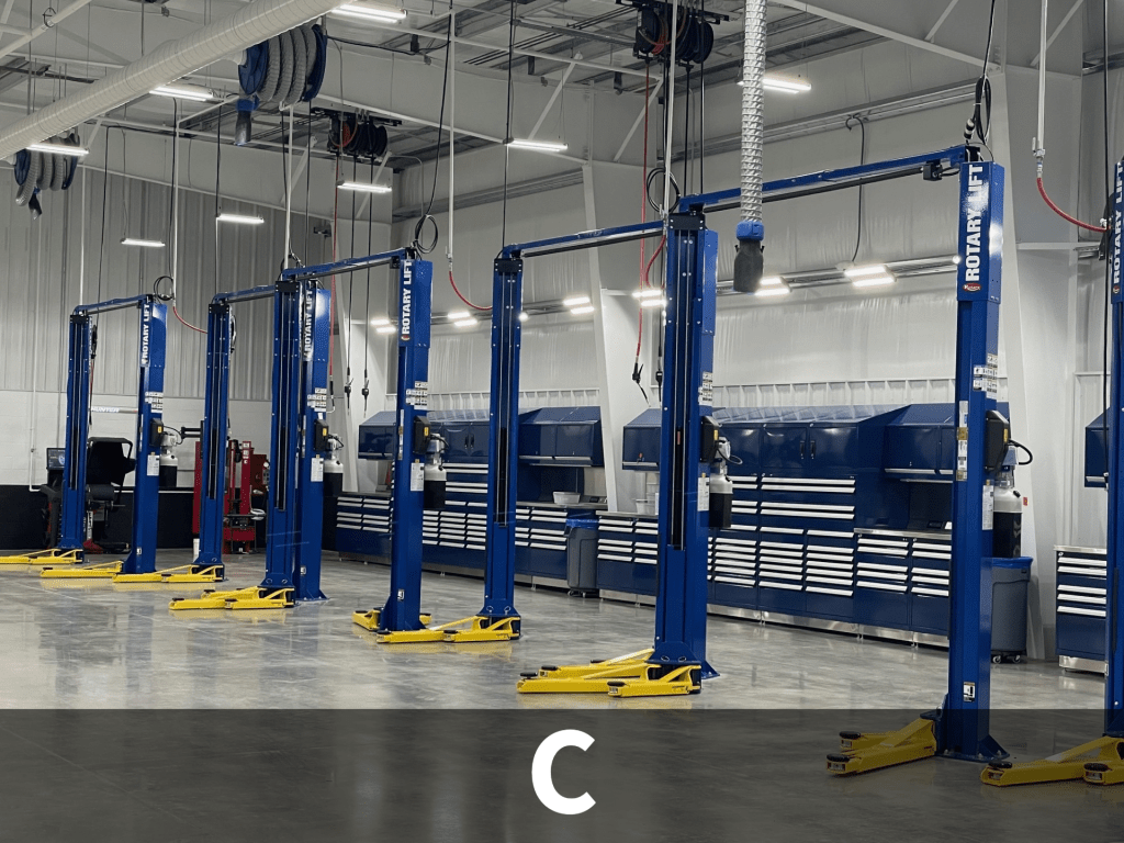 - C: Service Bays (Lifts, Lube & Air reels, Workstations, Overhead Exhaust System)