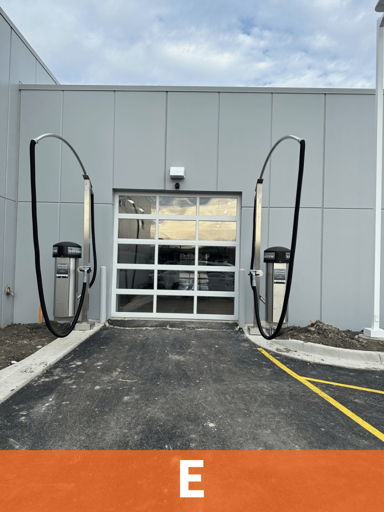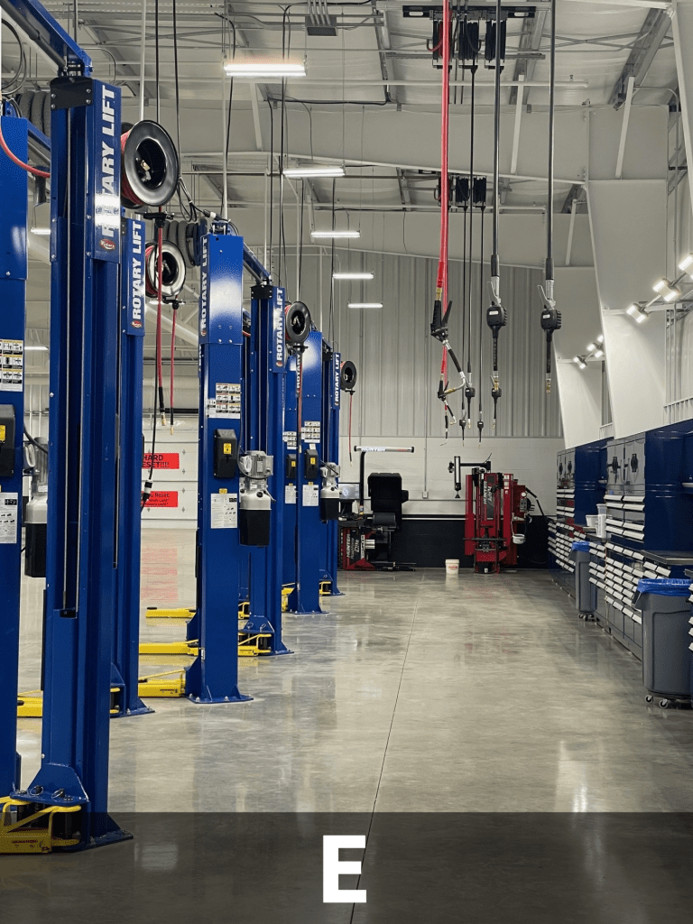 - E: Service Bays (Lifts, Lube & Air reels, Workstations, Overhead Exhaust System)