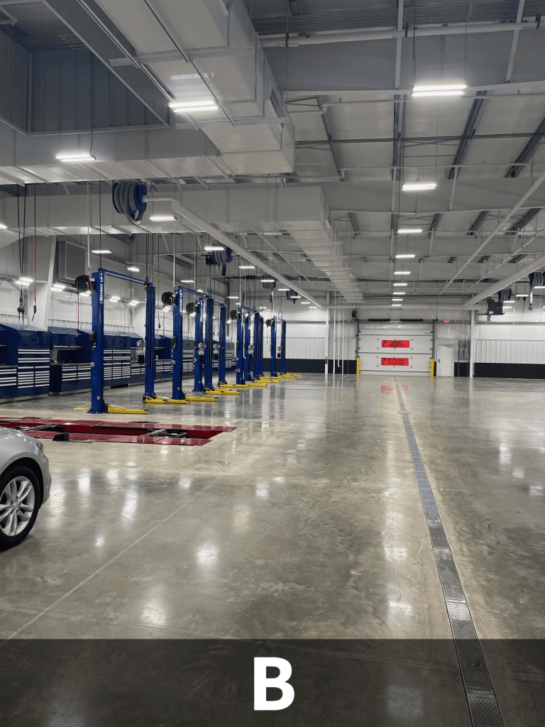 - B: Service Bays (Lifts, Lube & Air reels, Workstations, Overhead Exhaust System)